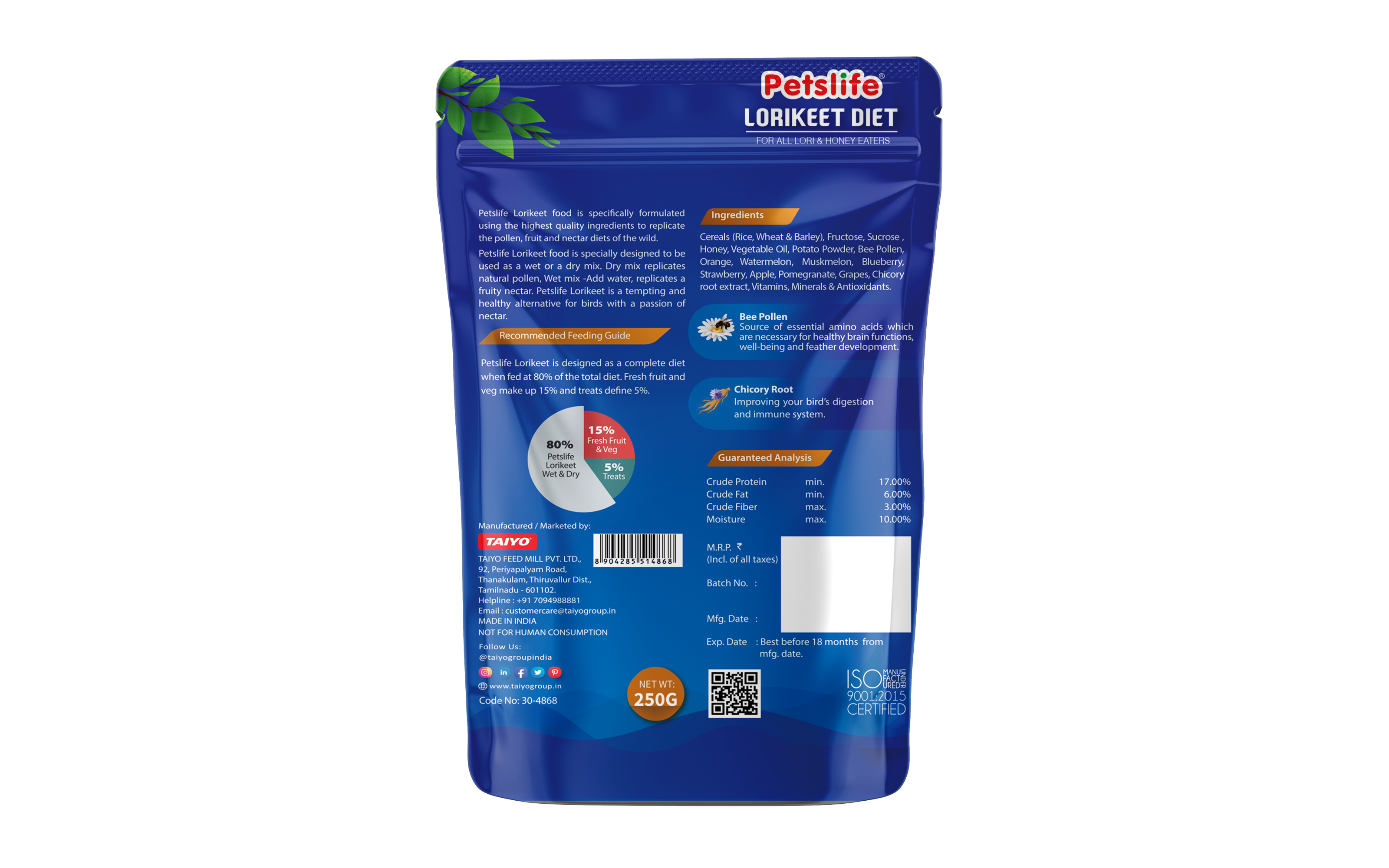Replicates what the nectar birds would eat in nature. Easily Dissolves in water. Formulated to meet the intensive needs and nutritional requirements of lorries, lorikeets & other nectar eating birds. Vitamin & Mineral fortified.