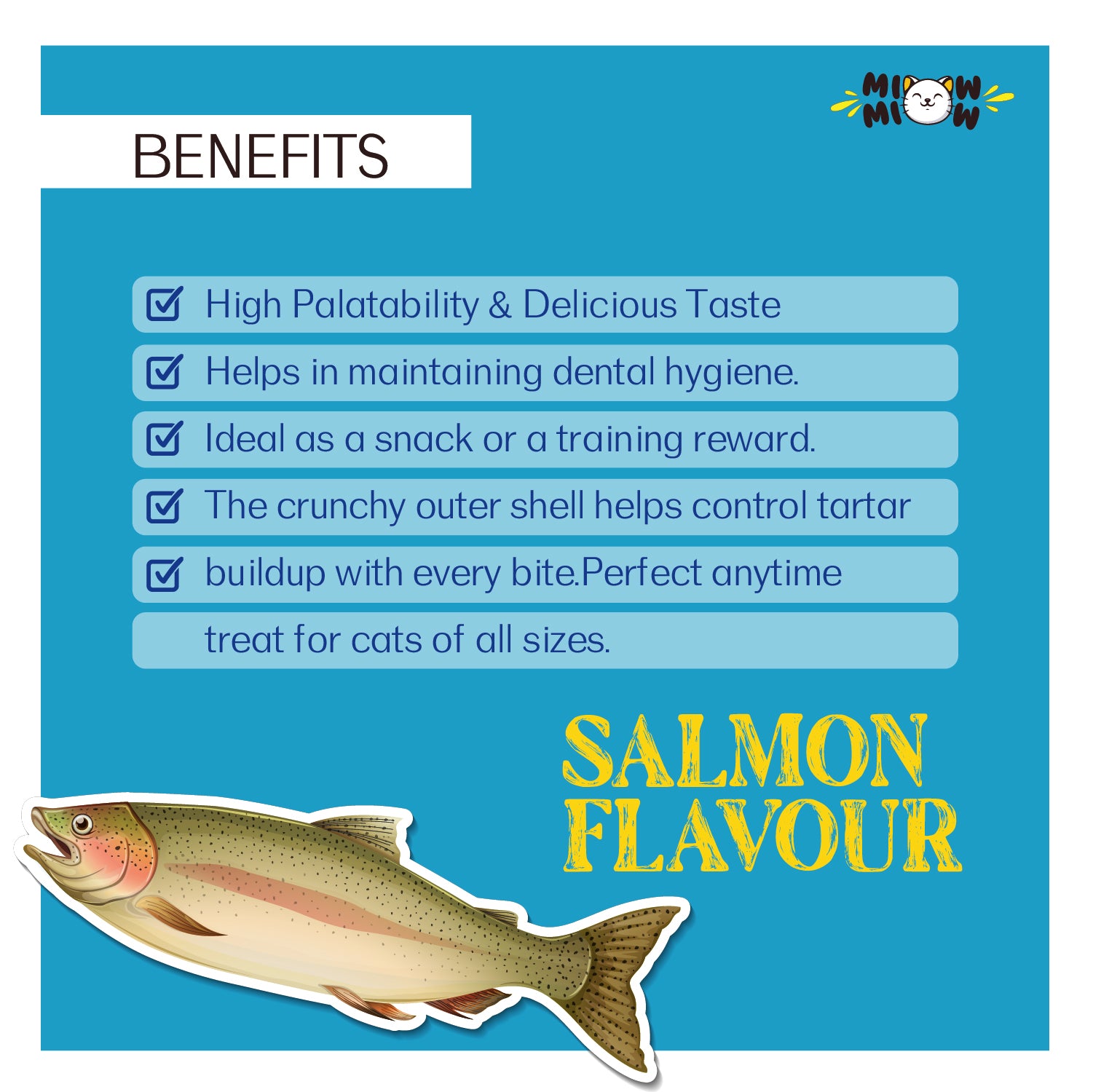 Supports Dental Health: The crunchy texture of our Miow Miow Salmon-Flavored Cat Biscuits helps to clean your cat’s teeth and reduce plaque and tartar buildup. These treats are a tasty way to contribute to your cat’s dental hygiene.