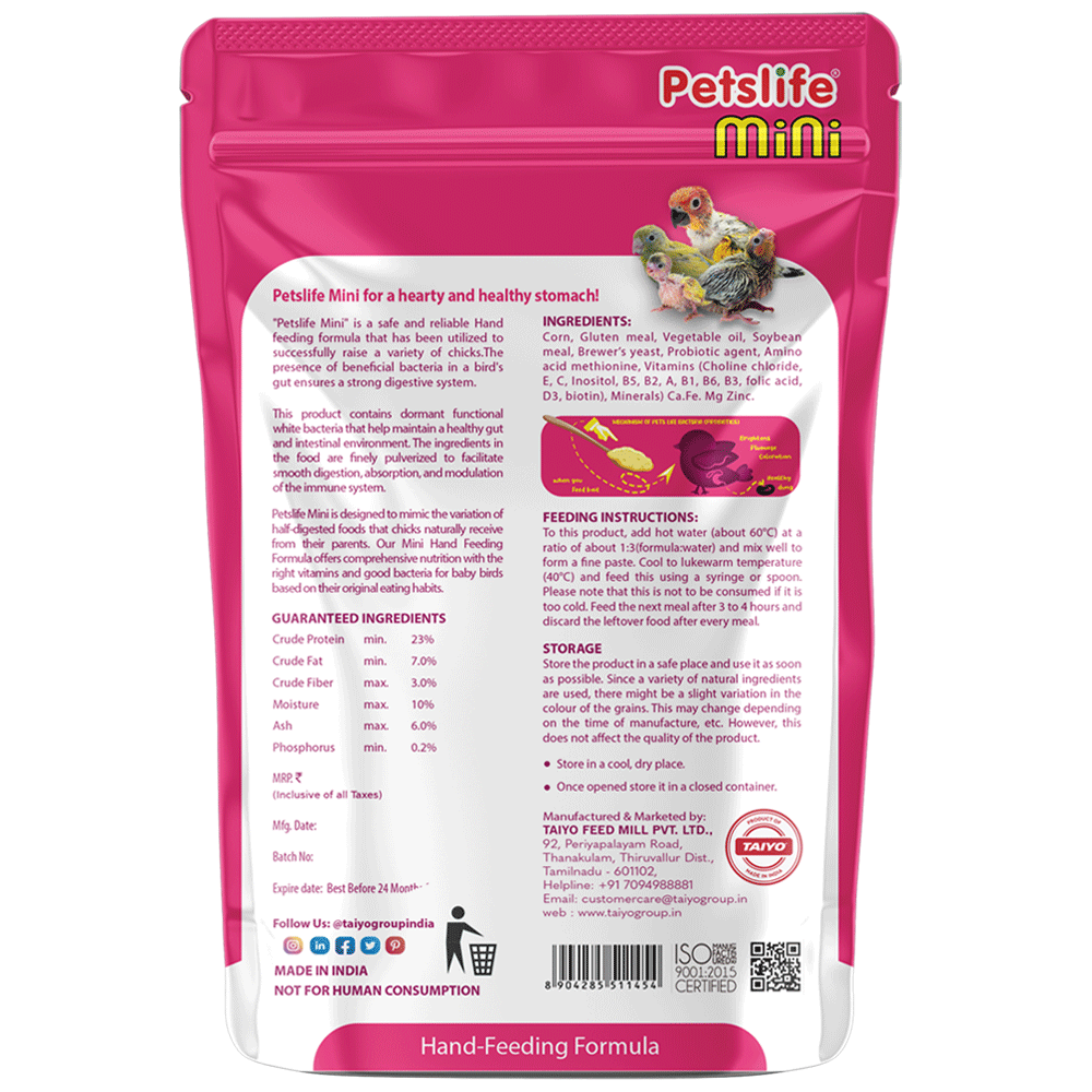 “Petslife Mini” is a safe and reliable Hand feeding formula that has been utilized to successfully raise a variety of chicks. The presence of beneficial bacteria in a bird’s gut ensures a strong digestive system.
